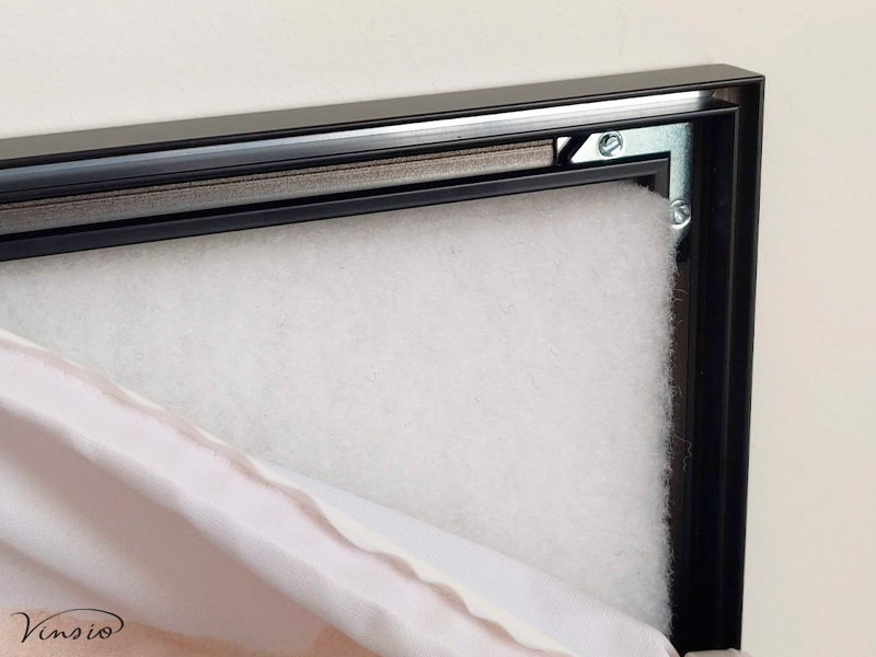 Een textielframe bestaat uit een aluminium frame waarin een doek strak wordt gespannen. Dit doek kan volledig worden gepersonaliseerd met afbeeldingen, logo’s, teksten of patronen. Achter het doek bevindt zich akoestisch materiaal dat geluidsgolven absorbeert en de nagalm in een ruimte vermindert. Deze combinatie zorgt voor zowel esthetische als functionele voordelen.