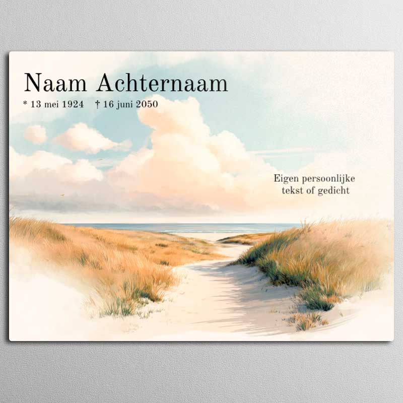 Dit gedenkbord toont een zacht gekleurd duinpad dat uitmondt in de zee, onder een lucht vol wolken. Het is een rustgevend beeld dat symbool staat voor de overgang en de weg naar een eeuwige horizon. Je kunt dit bord eenvoudig online personaliseren met een naam, datum of persoonlijke tekst, zodat het een uniek en liefdevol aandenken wordt.