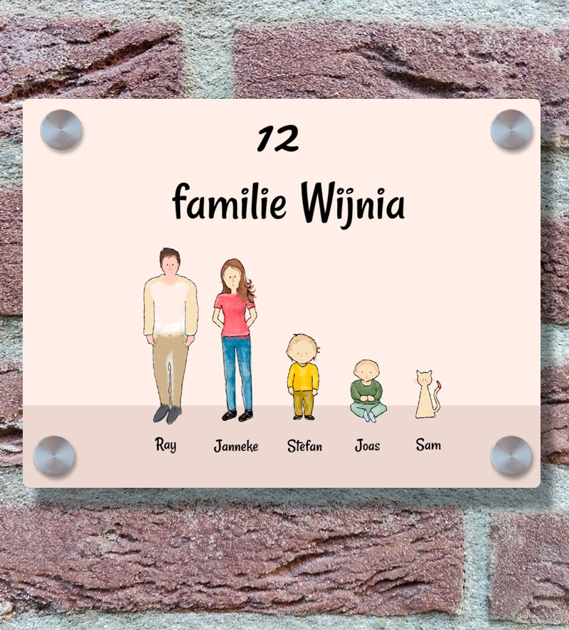Unieke en mooie naambordje met familie icoontjes voor plaatsing bij de voordeur. Ontwerp online je familie met unieke icoontjes op het naambordje met geborstelde afwerking. Het naambordje is voorzien van afgeronde hoeken en kan worden geleverd met RVS afstandhouders. Zo kan het naambordje zwevend naast de voordeur worden opgehangen