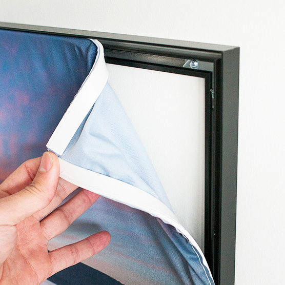 Laat je mooiste foto tot leven komen op een verwisselbaar textieldoek. Dankzij de siliconen pees rondom plaats je het doek eenvoudig in het aluminium frame. Zo wissel je moeiteloos van afbeelding en blijf je flexibel in je interieur of werkruimte.