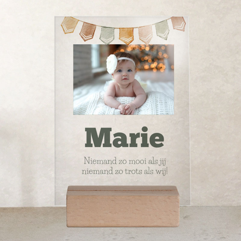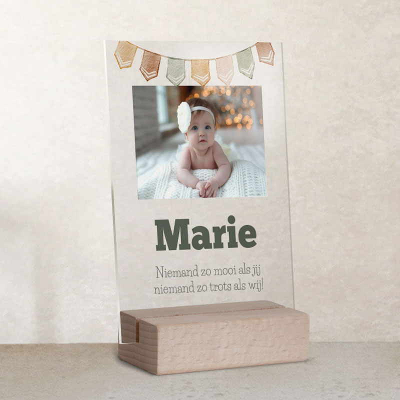 Heel mooi geboortebord met een foto personaliseren en tekst. Het geboortebord is gemaakt van helder plexiglas. Dit geeft een mooi en uniek effect. Het geboortebord kan worden geleverd met een houten houder, zodat het bord in de kamer van de baby of op een andere mooie plek kan worden gezet. Je kan het bord online op maat personaliseren. Zo kan je leuke illustraties, foto’s en teksten toevoegen.