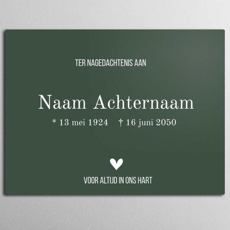 Dit gedenkbord is ontworpen om herinneringen tastbaar te maken. Met jouw eigen foto, naam, datum of korte boodschap creëer je eenvoudig een uniek herdenkingsbordje dat precies past bij de persoon of dier dat je wilt herdenken. Je personaliseert het ontwerp direct online en ziet meteen hoe het eindresultaat eruit komt te zien.
