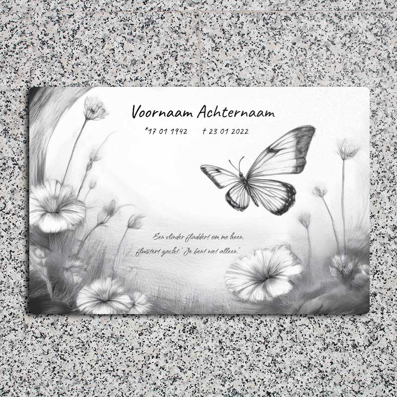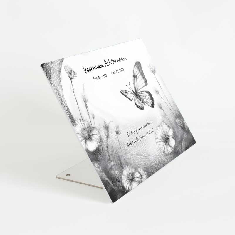 Op het gedenkbord staat een mooie tekening van een kleurrijke vlinder met bloemen met een mooie achtergrond. Het gedicht is naar wens aan te passen met een eigen persoonlijke gedicht.