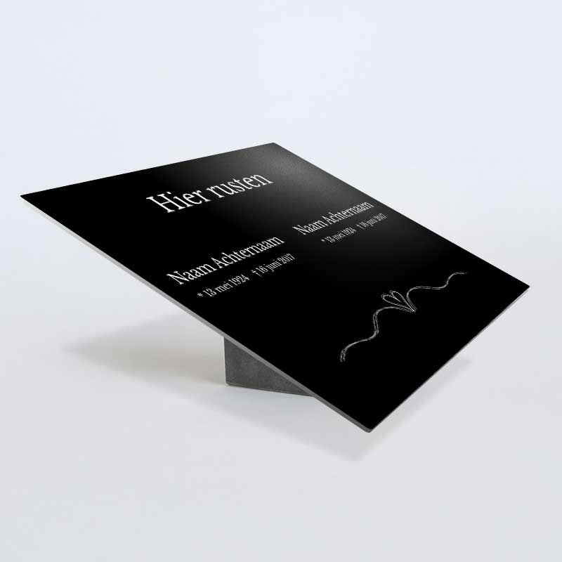 Dit gedenkbord is ontworpen om twee namen te dragen, aangevuld met een symbool naar keuze en een persoonlijke tekst of gedicht. Zo kun je het bordje volledig afstemmen op jouw herinnering.