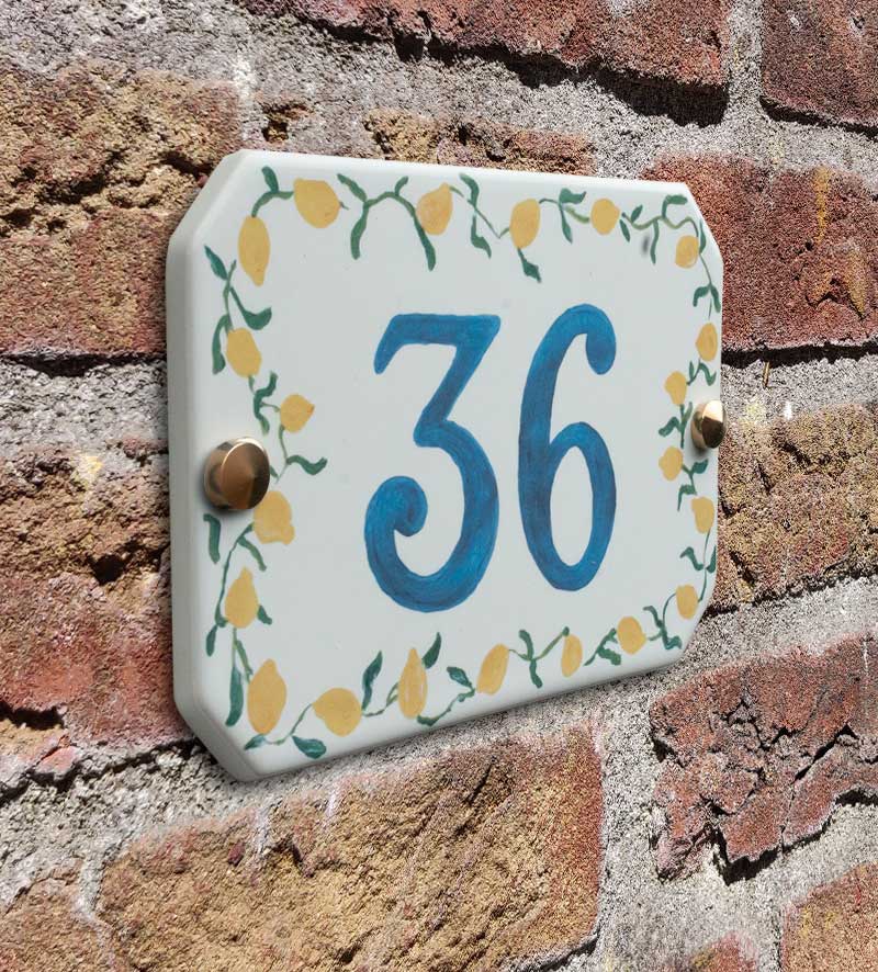Dit bordje is perfect voor wie houdt van een landelijke stijl met een vleugje zuidelijke charme. De frisse citroenenrand geeft een vrolijke en gastvrije uitstraling bij de voordeur. De cijfers zijn in aquarelstijl geschilderd en worden samen met het glazuur gebakken. Hierdoor zijn ze krasvast, UV-bestendig en behouden ze hun kleur – ook na vele jaren buiten.
