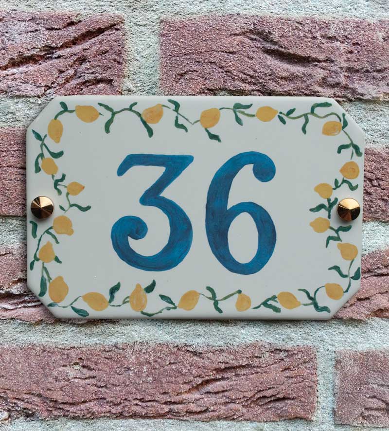 Dit huisnummerbordje is gemaakt van hoogwaardig porselein, rechtstreeks afkomstig uit Italië. De rand is met de hand versierd met aquarel geschilderde citroenen en groene blaadjes, wat het bordje een mediterrane, zonnige uitstraling geeft. Het ontwerp wordt in het glazuur van het porselein meegebakken bij zeer hoge temperaturen. Hierdoor ontstaat een huisnummerbord dat niet alleen prachtig oogt, maar ook levenslang meegaat.