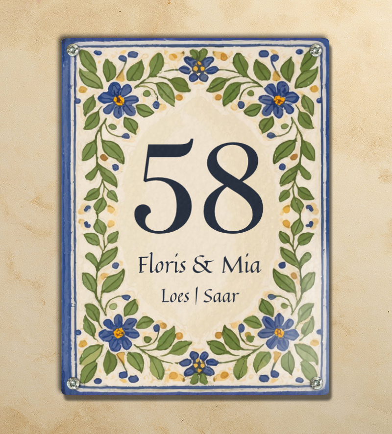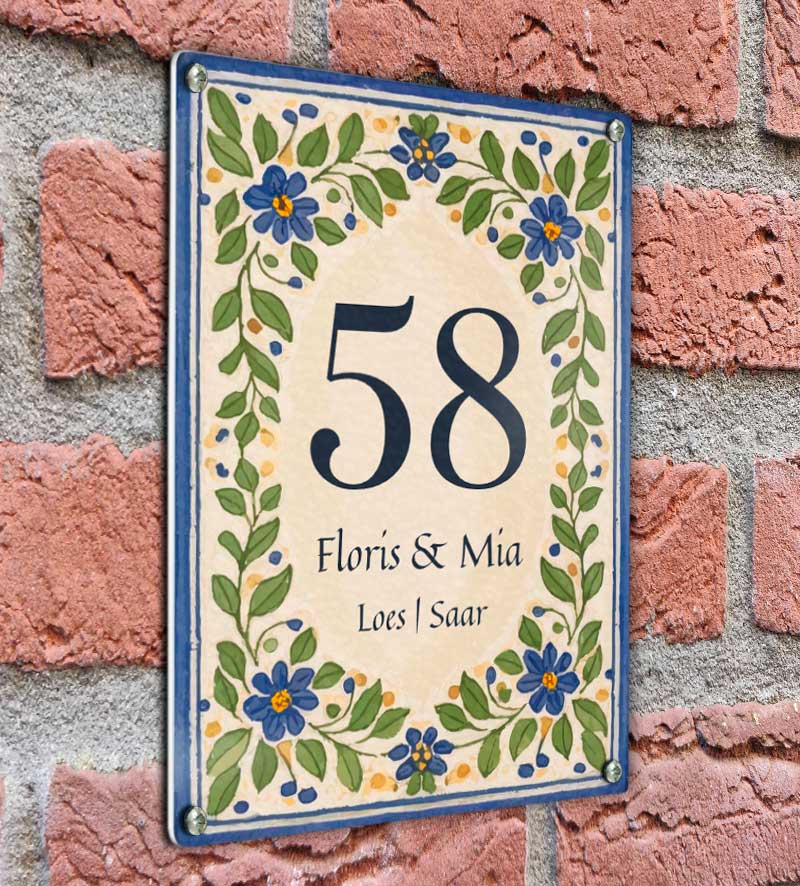 Landelijk naambordje met een decoratieve bloemen rand. Het naambordje is gemaakt van aluminium en heeft een luxe en degelijke uitstraling en voelt sterk en stevig aan.