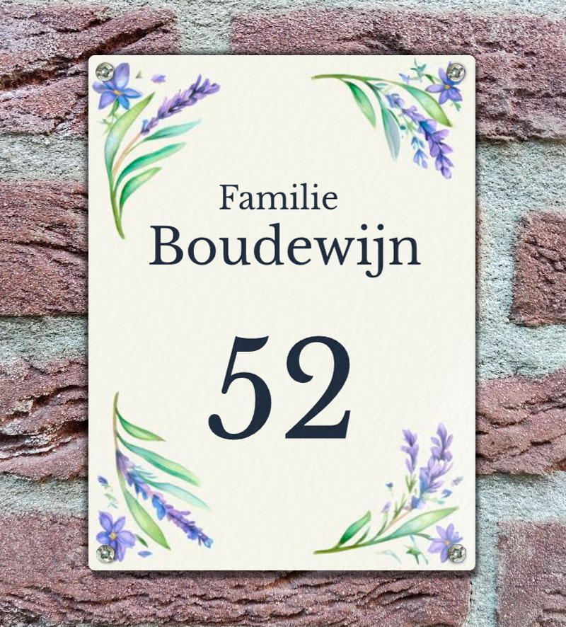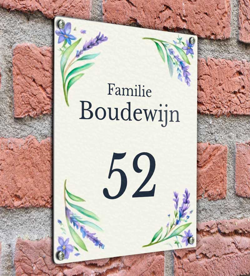 Geef je woning een warme en stijlvolle uitstraling met dit landelijke naambordje voor bij de voordeur. Het bordje is voorzien van een prachtige lavendel border, waardoor het direct een vriendelijke en decoratieve uitstraling krijgt. Ideaal als huisnummerbord én om de familienaam bij de voordeur te tonen.