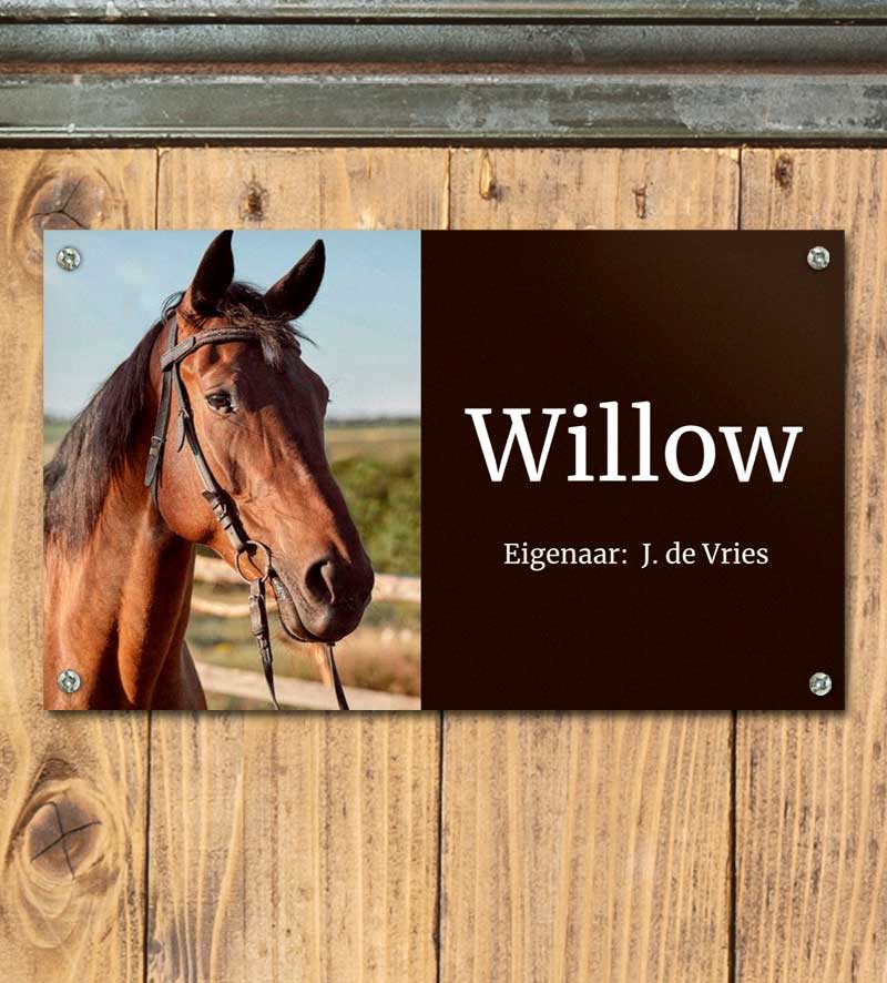 Paarden stalbord met een foto met eigen tekst. Ideaal om de naam van je paard, de eigenaar of een datum weer te geven.