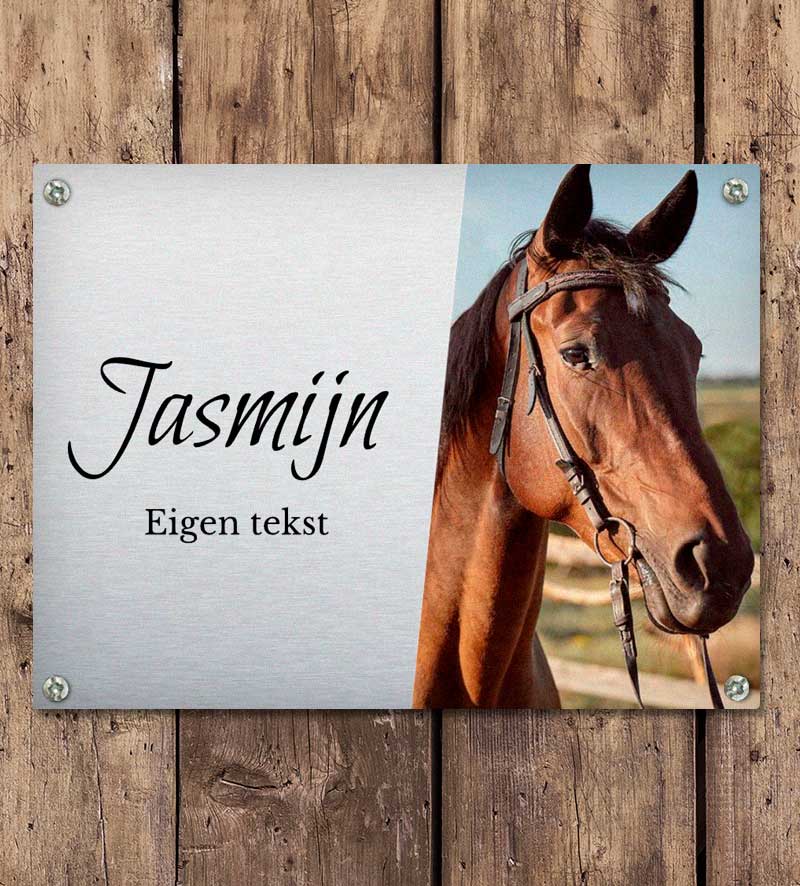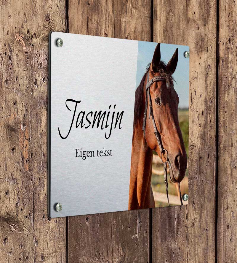 Mooi naambordje voor in de paarden stal. Keuze uit klein formaat en groot formaat. Het paarden stalbordje kan worden voorzien van een boorgat in elke hoek, zodat het eenvoudig in de stal kan worden opgehangen. Het naambordje is volledig te personaliseren met eigen foto en tekst.