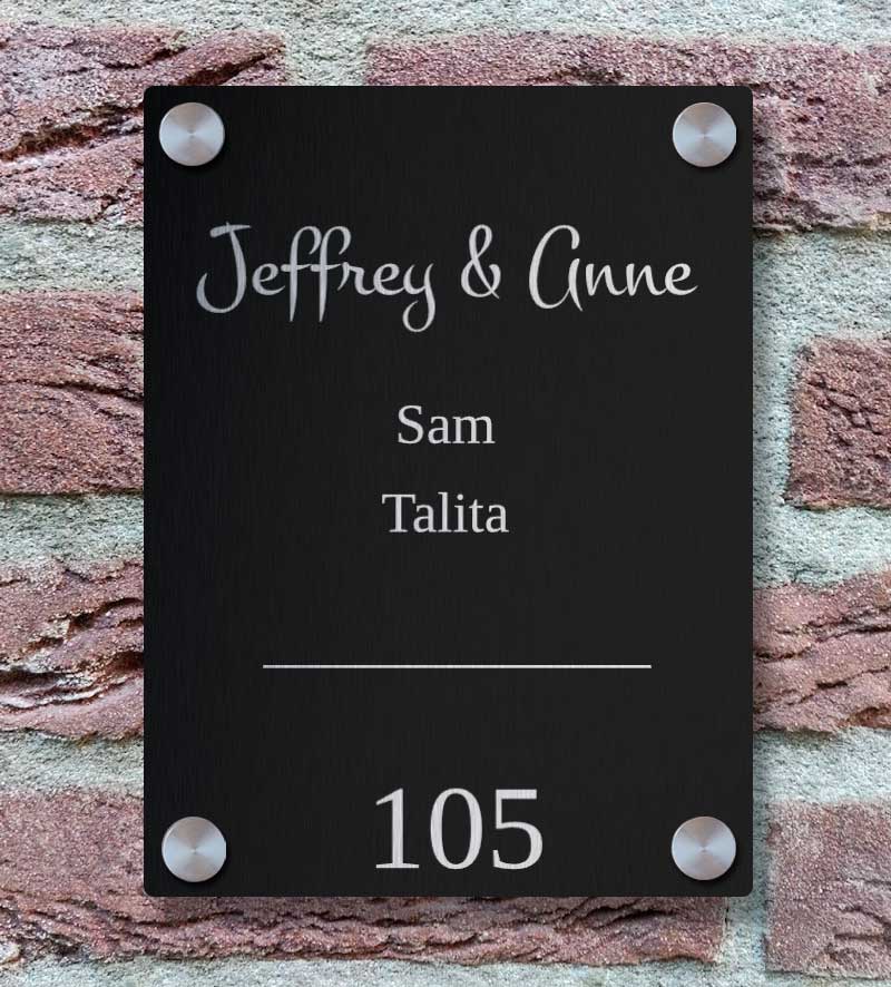 Naambordje voor bij de voordeur met een industrieel design. Het naambordje is uitgevoerd met een geborstelde aluminium ondergrond waarop de zwarte inkt wordt gezet. Hierdoor krijgen de tekst en iconen een mooie geborstelde RVS look. De combinatie van zwart en geborsteld aluminium zorgen voor een strak en modern design. De afgeronde hoekjes maken het naambordje helemaal af. Een prachtig naambordje als je voor een industriële look en feel wil gaan.