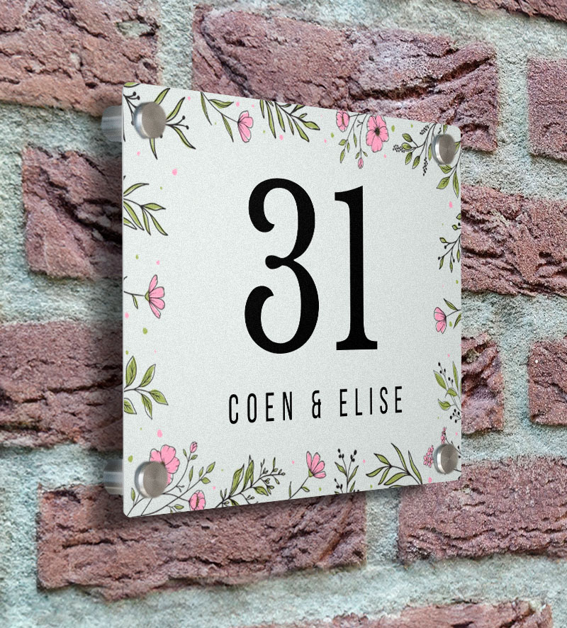 Naambord voordeur in landelijke stijl met sierlijke bloemenrand