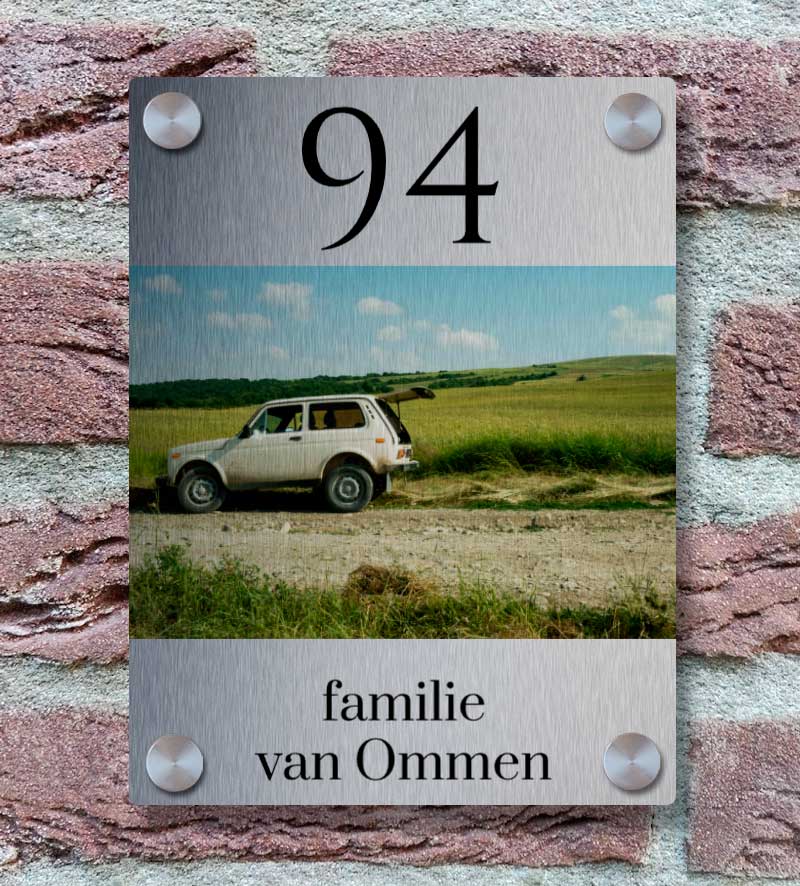 Een naambordje voor bij de voordeur kan eenvoudig online ontworpen worden. De namen, huisnummer en een foto zijn naar wens aan te passen. Je ontwerp wordt geprint op een RVS look naambordje. De witte delen van je foto krijgen dan een RVS look. Dit heeft een zeer mooi effect.