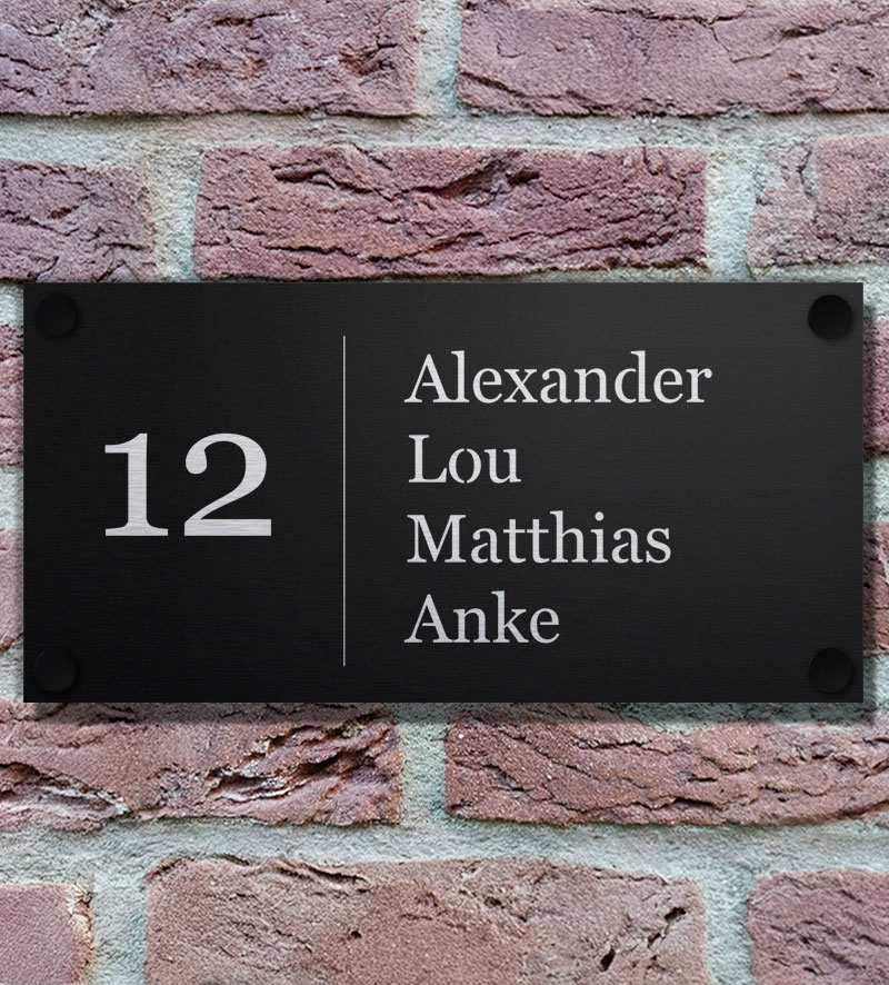 Dit zwarte naambordje van geborsteld aluminium combineert een strakke vormgeving met een persoonlijk tintje. Het bord is horizontaal (30 × 15 cm) en heeft links ruimte voor het huisnummer en rechts plaats voor de familienaam of meerdere gezinsnamen. Tussen beide delen loopt een dunne lijn, wat zorgt voor een duidelijke scheiding en een evenwichtig ontwerp. De zwarte print wordt rechtstreeks op het geborstelde aluminium aangebracht met UV-techniek. Daardoor blijft de fijne metallic structuur zichtbaar en ontstaat een subtiel contrast tussen de glanzende ondergrond en de matte zwarte opdruk. Het resultaat is een stijlvol bord dat goed leesbaar is, zowel van dichtbij als op afstand.
