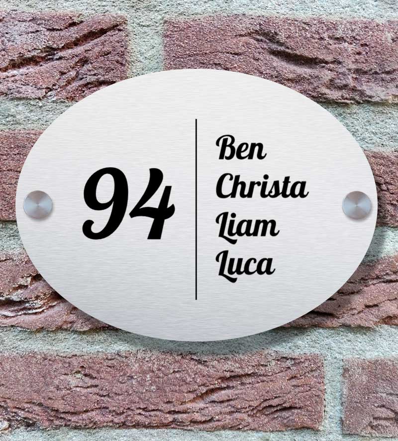 Ovaal RVS look naambord voor bij de voordeur. Door de mooie ovale vorm krijgt het een nostalgische uitstraling.. Het naambordje kan met RVS afstandhouders naast de voordeur zwevend aan de muur worden bevestigd.