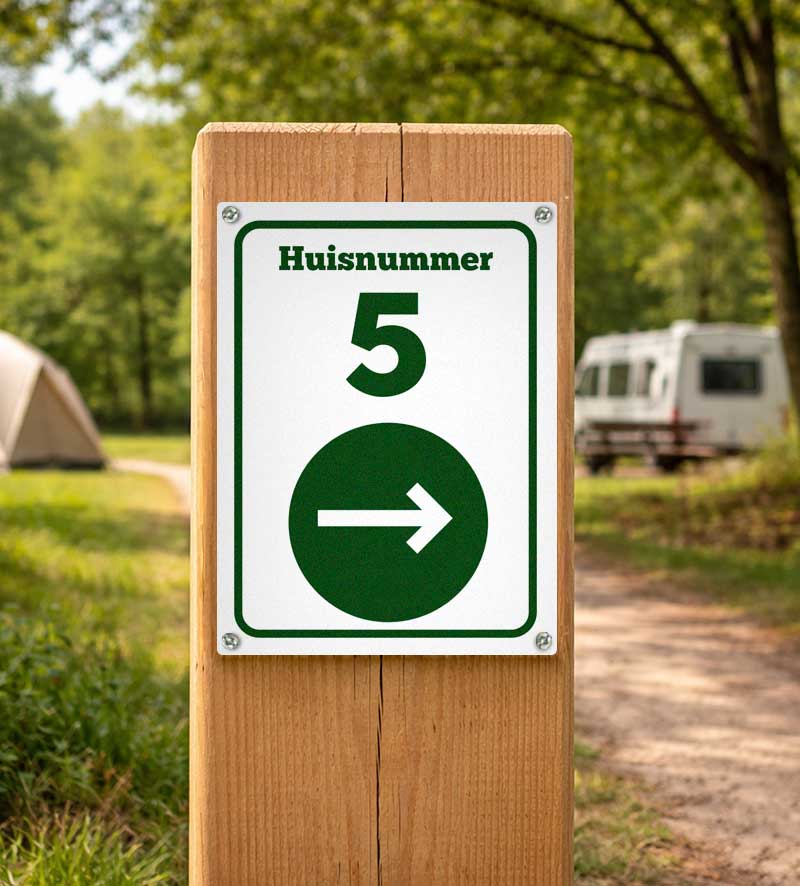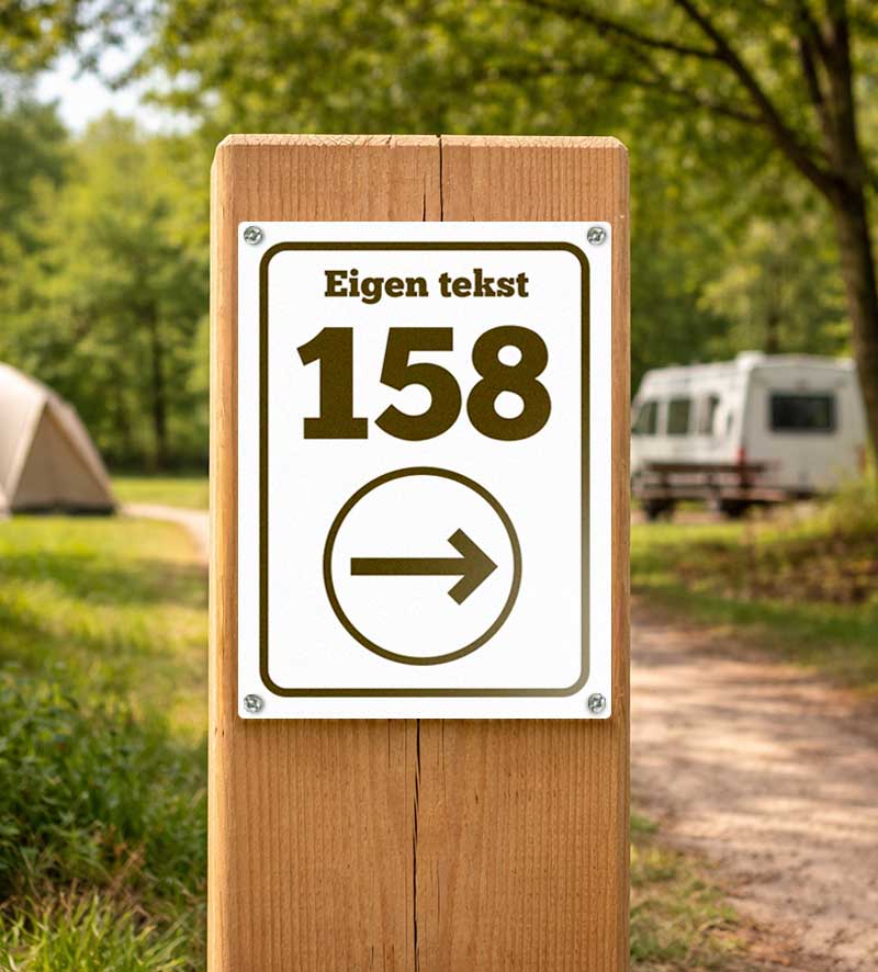 Dit routebord is geschikt voor het aangeven van plaatsnummers en huisnummering op campings, recreatieparken en andere terreinen. Het bord zorgt voor een duidelijke en consistente nummeraanduiding, waardoor bezoekers eenvoudig de juiste locatie kunnen vinden. Door de personaliseerbare tekst en pijlrichting is het bord inzetbaar voor zowel vaste als tijdelijke routes.