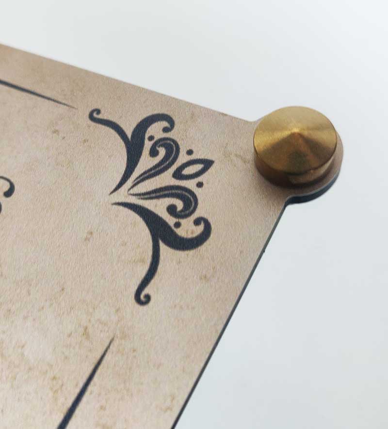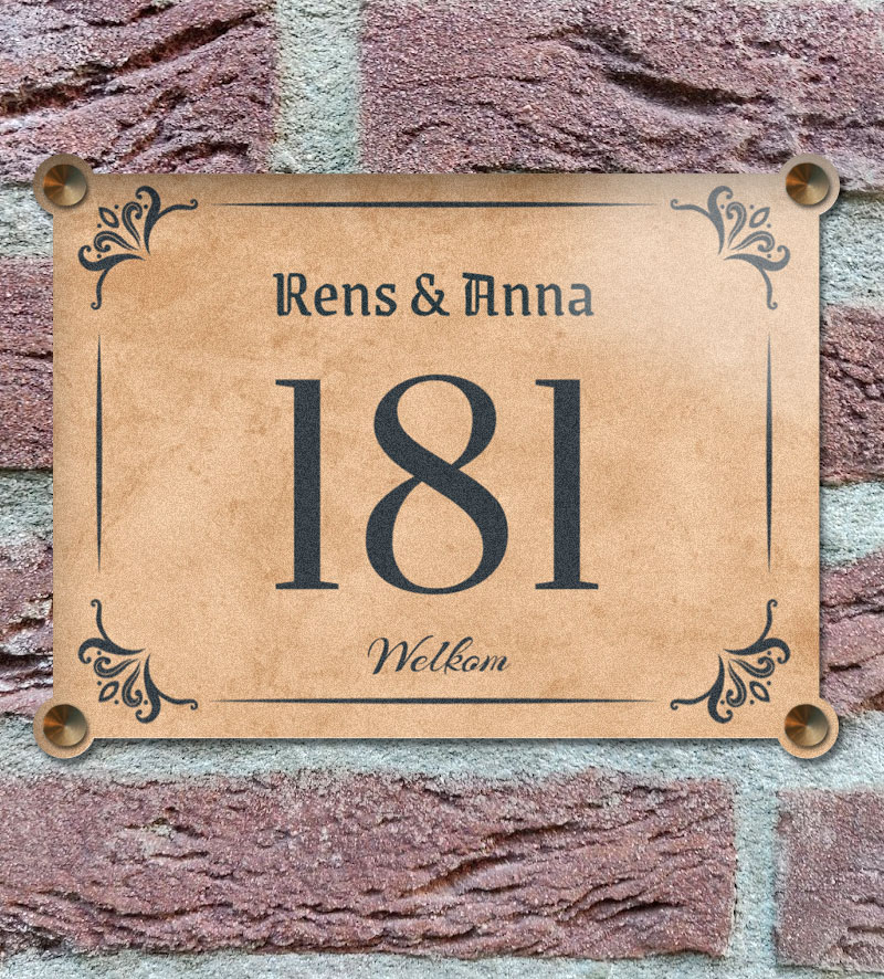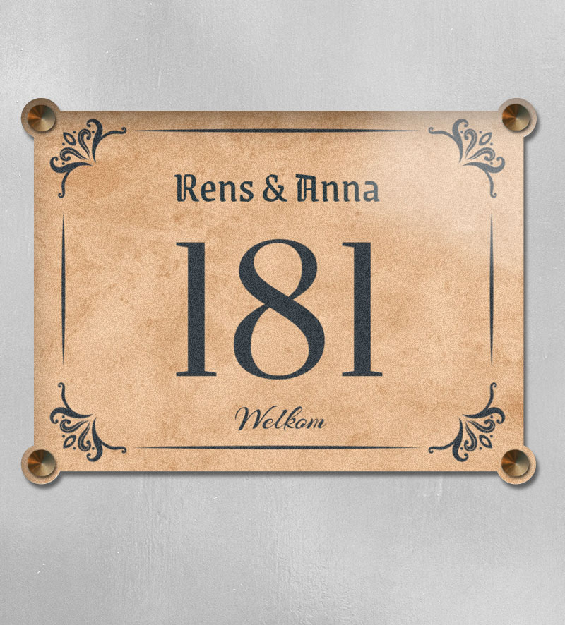 Het naambordje is geschikt voor binnen en buiten gebruik. Leuk om het naambordje te ontwerpen met je familienaam en je huisnummer. Het naambordje kan worden voorzien van boorgaten waardoor het naambordje met RVS schroeven aan de muur kan worden bevestigd. Kies je voor de optie met messing afdekdopjes, dan kan je de schroeven mooi afwerken met messing afdekdopjes.