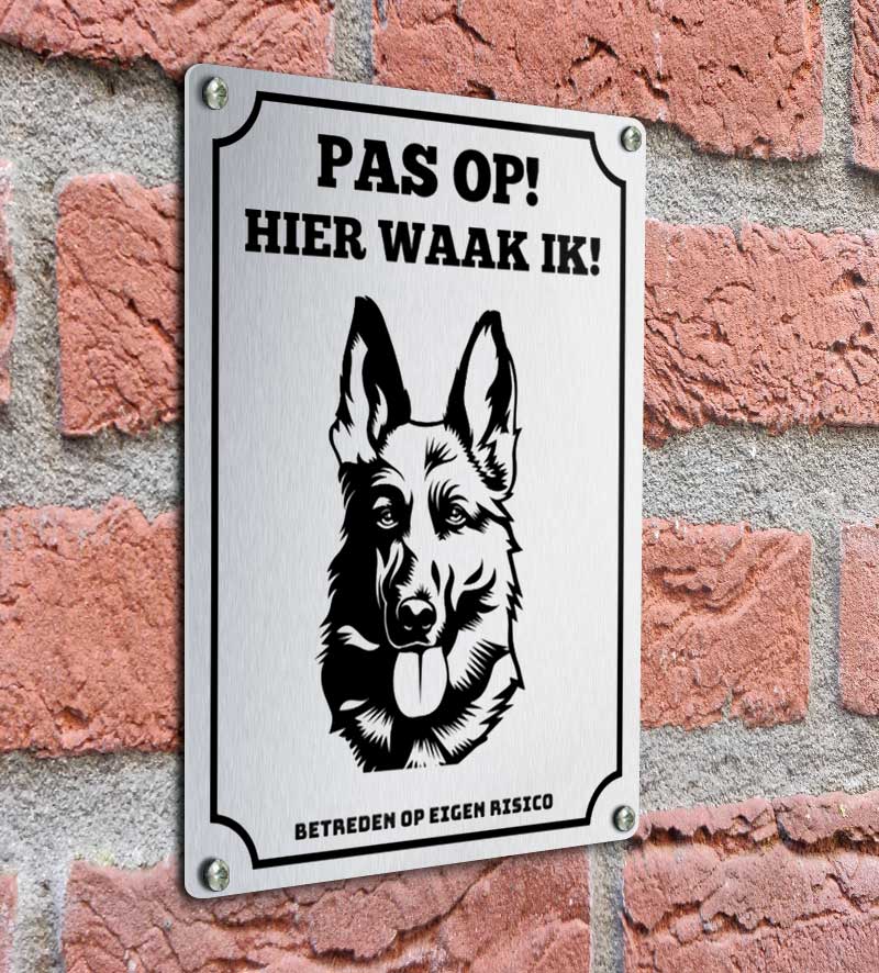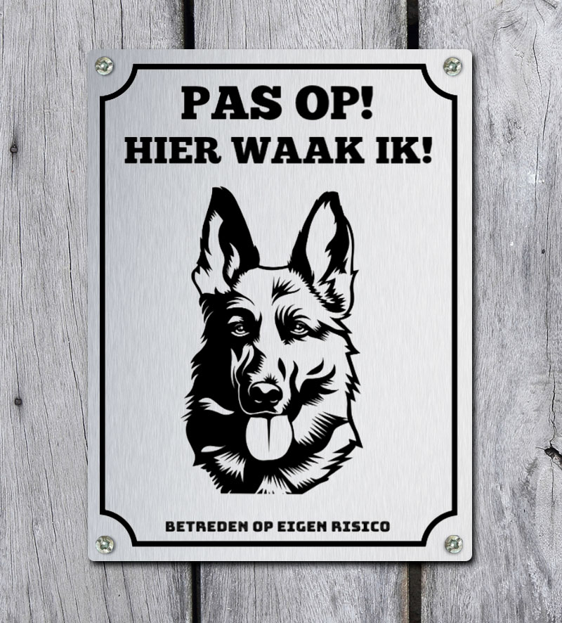 Opvallend honden waakbord met een illustratie van een Duitse herdershond. Een waakbord wat eventuele kwaadwillende afschrikt. Het waakbord kan je zelf online personaliseren met verschillende andere iconen van een herdershond. Een waakbord is gemaakt van aluminium en kan worden voorzien van boorgaten.