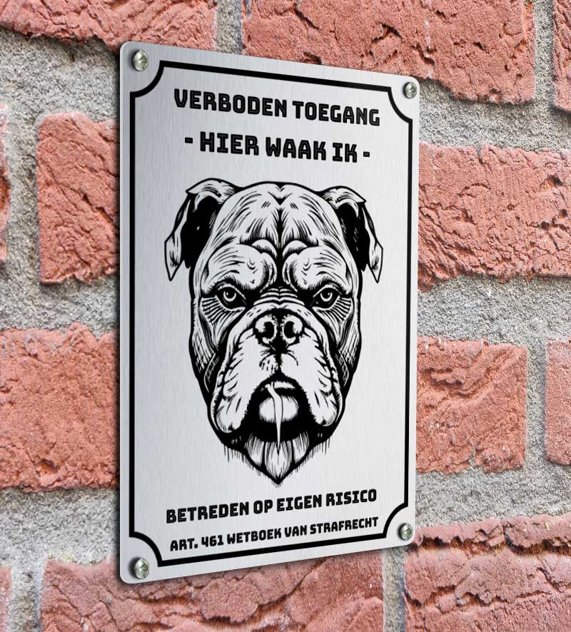 Waakbord hond met tekst verboden toegang en met een illustratie van een Engelse Bulldog. Een waakbord wat eventuele kwaadwillende afschrikt. Het waakbord kan je zelf online personaliseren met verschillende andere iconen van een Engelse Bulldog. Een waakbord is gemaakt van aluminium en kan worden voorzien van boorgaten.
