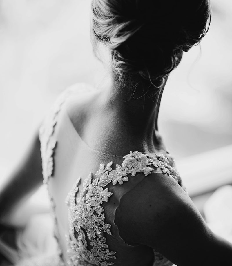 De kracht van zwart/wit foto’s is dat je beter let op de compositie van de foto. Je wordt niet meer afgeleid door de kleuren en je gaat meer kijken naar de vormen, structuur en lijnen in een foto. Het toepassen van een zwart / wit filter bij bruiloftsfoto’s kan daarom erg mooi zijn. Je kan extra nadruk leggen op de lijnen van een trouwjurk of de structuur hiervan.